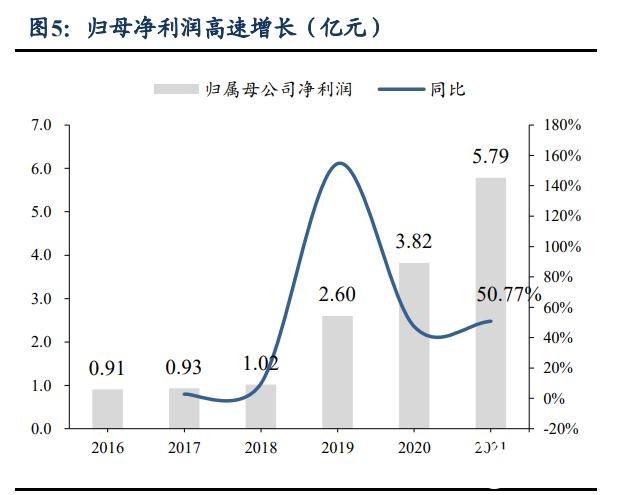 營收和凈利潤高速增長。2016-2021 年,公司營業收入 CAGR 35.0%,歸母凈利潤 CAGR 44.9%。2021 年德業股份實現營業收入 41.68 億,同增 37.89%,歸母凈利潤 5.79 億,同增 50.77%。主要系儲能逆變器業務增長勢頭強勁。