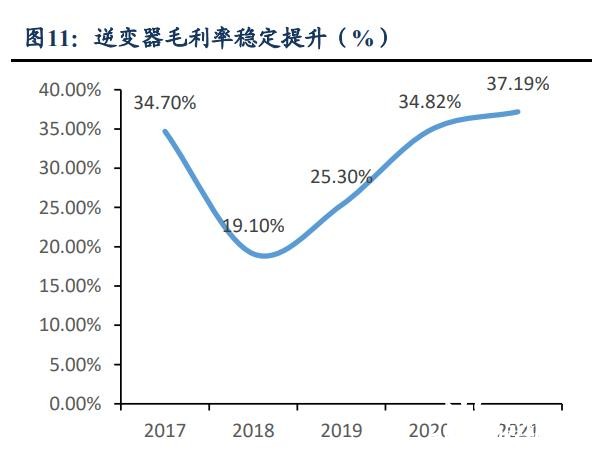 公司盈利穩健體現在其優秀的產品議價與成本管控能力:1)公司凈利率、毛利率 持續穩健。2019-2021 年公司毛利率分別 21.2%/22.6%/22.9%,呈穩步上升態勢;雖受不 同系列產品原料及銷售結構波動影響,綜合毛利率穩定在 20%以上;2)期間費用率持 續下降。從 2016 年的 10.4%下降至 2021 年的 7.8%,且研發費用穩步提升,主要是開發 新產品,加大對光伏逆變器技術投入。