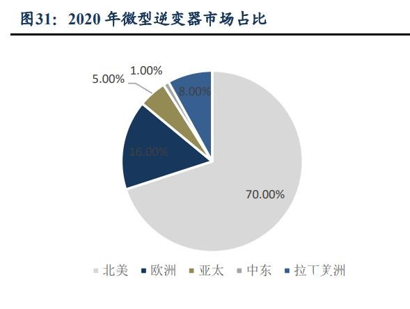 歐美 MLPE 中微逆占比不斷提升,拉丁、亞洲新興崛起帶來契機。歐美作為 MLPE 最主要出貨區域,這兩個地區 MLPE 不斷加速滲透,隨著微型逆變器與優化器之間成本 差距不斷縮小,性價比愈發凸顯,微型逆變器在 MLPE 中出貨占比不斷提升,2020 年 占比已達 31.58%,我們預計后續微逆占比仍將不斷提升。而亞洲、拉丁美洲作為微型逆 變器市場中的重要增長力量,由于政策成熟度相對較低,用戶付費能力較弱,因而成本 上具有較明顯優勢的國內廠商在該市場中將占有一定優勢。