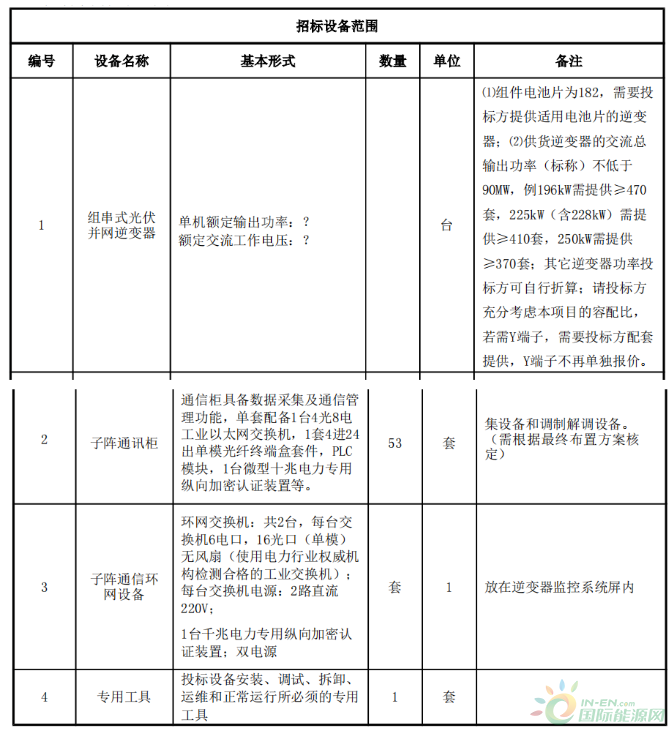 根據招標公告,供貨逆變器的交流總輸出功率(標稱)不低于90MW,例196kW需提供≥470套,225kW(含228kW)需提供≥410套,250kW需提供≥370套。招標內容與范圍為: