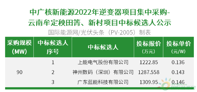 國際能源網/光伏頭條(PV-2005)獲悉,12月22日,中廣核新能源2022年逆變器項目集中采購-云南牟定秧田箐、新村項目中標候選人公示。上能電氣股份有限公司、神州數碼(深圳)有限公司、廣東藍能科技有限公司3家企業入圍。