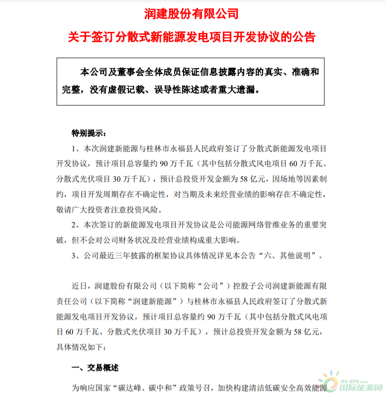 協(xié)議顯示,為響應(yīng)國(guó)家“碳達(dá)峰、碳中和”政策號(hào)召,加快構(gòu)建清潔低碳安全高效能源體系,潤(rùn)建新能源擬與永福縣人民政府在分散式光伏、分散式風(fēng)電等領(lǐng)域進(jìn)行戰(zhàn)略合作,通過(guò)整合利用永福縣閑散的水塘、洼地、灘涂、荒山荒地、工業(yè)園區(qū)等閑置土地,以及土地性質(zhì)滿足風(fēng)光新能源建設(shè)要求的一般農(nóng)用地、林地資源,實(shí)施整縣分散式光伏發(fā)電、分散式風(fēng)力發(fā)電項(xiàng)目。預(yù)計(jì)項(xiàng)目總?cè)萘考s90萬(wàn)千瓦(其中包括分散式風(fēng)電項(xiàng)目60萬(wàn)千瓦、分散式光伏項(xiàng)目30萬(wàn)千瓦),預(yù)計(jì)風(fēng)電投資金額46億元,光伏投資金額12億元總投資開(kāi)發(fā)金額為58億元。