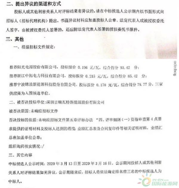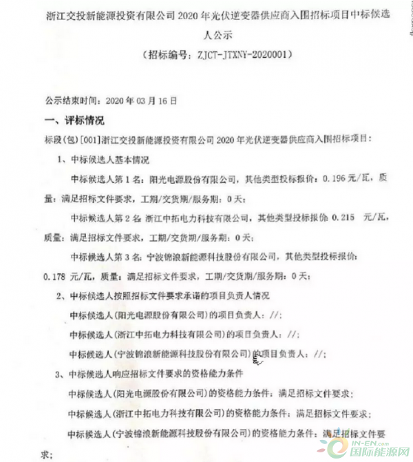 陽光電源股份有限公司以0.196元/瓦的報(bào)價(jià),位列第一中標(biāo)候選人;浙江中拓電力科技有限公司以0.215元/瓦的報(bào)價(jià),位列第二中標(biāo)候選人;寧波錦浪新能源科技股份有限公司以0.178元/瓦的報(bào)價(jià)位列第三中標(biāo)候選人。