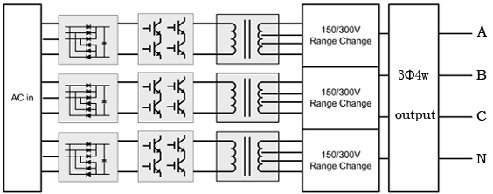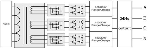 | 特點: ·一個輸出變壓器三組繞組,一組變流器, IGBT 使用數(shù)量僅 6 個·僅能供三相負載使用 ( 無法各相單獨取用 ) ,不適合三相不平衡負載 ·此結構僅能制作于一機箱 |
