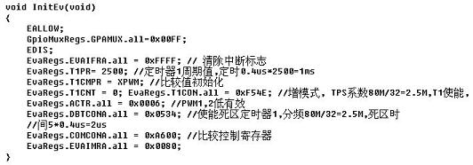 利用F28335內部的事件管理器模塊的3個全比較單元、通用定時器1、死區發生單元及輸出邏輯可以很方便地生成三相六路SPWM波形。實際應用時在程序的初始化部分建立一個正弦表,設置通用定時器的計數方式為連續增計數方式,在中斷程序中調用表中的值即可產生相應的按正弦規律變化的SPWM波。SPWM波的頻率由定時時間與正弦表的點數決定。