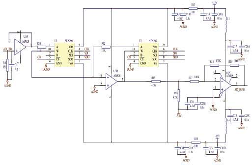 電壓檢測是完成閉環控制的重要環節,為了精確的測量線電壓,通過TMS320F28335的SPI總線及GPIO口控制對輸入的線電壓進行衰減/放大的比例以滿足A/D模塊對輸入信號電平(0-3V)的要求。電壓檢測模塊采用256抽頭的數字電位器AD5290和高速運算放大器AD8202組成程控信號放大/衰減器,每個輸入通道的輸入特性為1MΩ輸入阻抗+30pF。電壓檢測模塊電路原理圖如圖4所示。