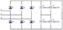 采用二極管不可控整流電路以提高網側電壓功率因數,整流所得直流電壓用大電容穩壓為逆變器提供直流電壓,該電路由6只整流二極管和吸收負載感性無功的直流穩壓電容組成。整流電路原理圖如圖2所示。