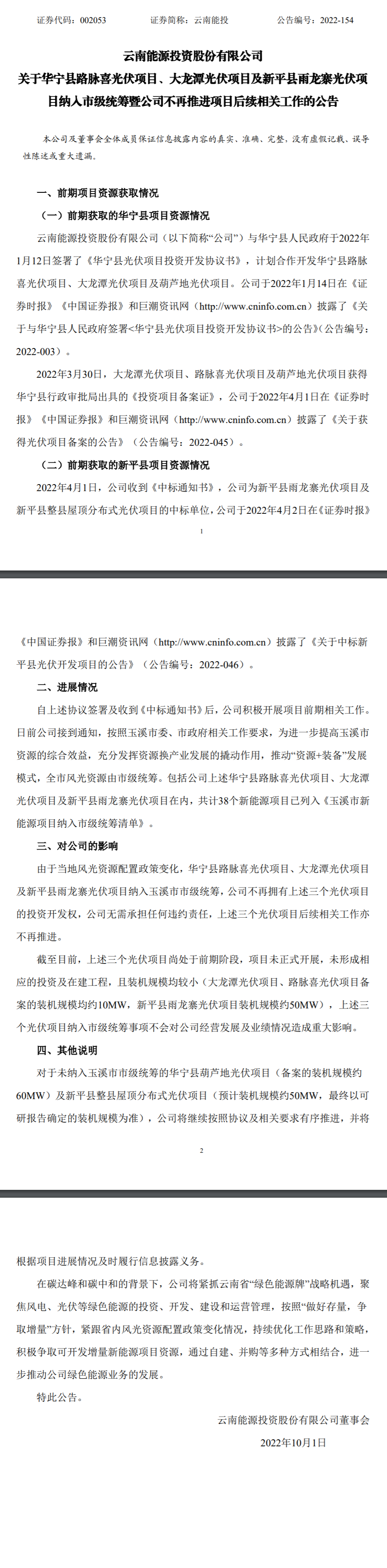 由于當地風光資源配置政策變化,華寧縣路脈喜光伏項目、大龍潭光伏項目及新平縣雨龍寨光伏項目納入玉溪市市級統籌,云南能投不再擁有上述三個光伏項目的投資開發權,上述三個光伏項目后續相關工作亦不再推進。