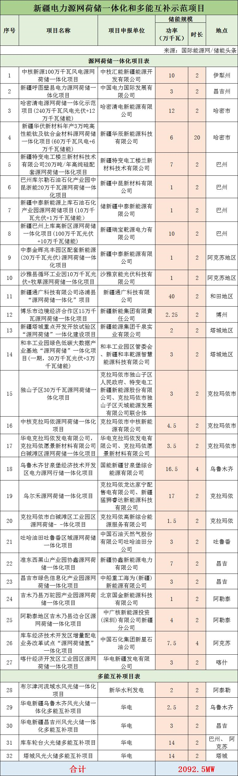 新疆2022年公示兩批市場化并網新能源項目清單。其中包括32個源網荷儲一體化、多能互補市場化項目,儲能規模為2092.5MW。